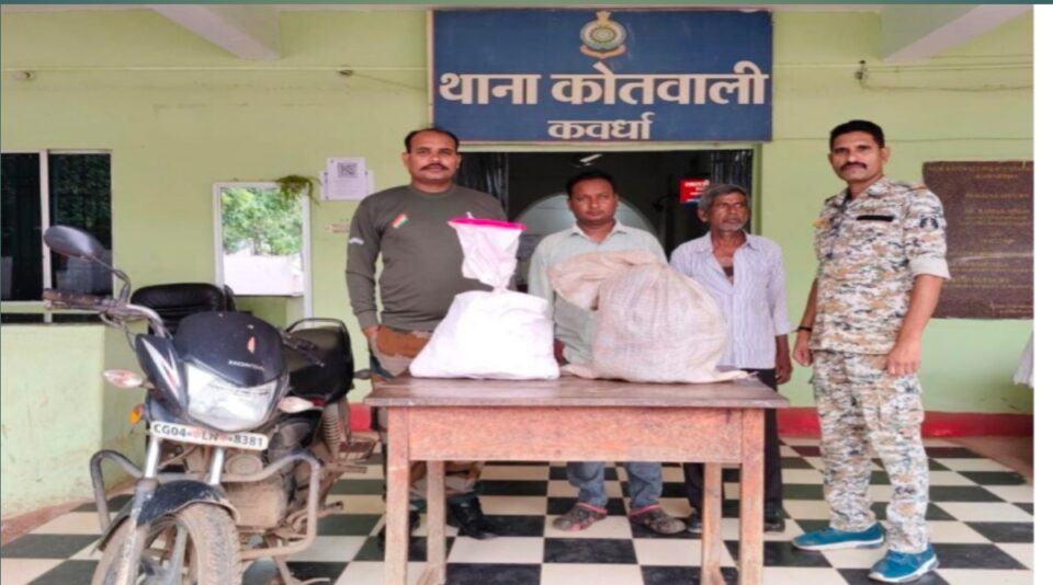 अवैध रूप से बेचने के लिए जमा शराब की बड़ी खेप जब्त, दो आरोपी गिरफ्तार*पुलिस अधीक्षक कबीरधाम श्री धर्मेन्द्र सिंह के निर्देशन में, अतिरिक्त पुलिस अधीक्षक श्री पुष्पेन्द्र बघेल एवं श्री पंकज पटेल के मार्गदर्शन तथा अनुविभागीय अधिकारी (पुलिस) श्री कृष्णा चंद्राकर पर्यवेक्षण एवं थाना प्रभारी निरीक्षक श्री लालजी सिन्हा के नेतृत्व में थाना कवर्धा पुलिस द्वारा अवैध शराब तस्करी पर कार्यवाही करते हुए दो आरोपियों को गिरफ्तार कर 80 पौवा देशी शराब एवं एक मोटर सायकल जप्त किया गया।दिनांक 27.07.2025 को थाना कवर्धा में पदस्थ उप निरीक्षक रजनीकांत दीवान अपने हमराह स्टाफ व शासकीय वाहन के साथ मुखबिर से प्राप्त सूचना के आधार पर भैंसा पसरा कवर्धा क्षेत्र में दबिश दी। मौके पर मुखबिर के बताए हुलिए के दो व्यक्ति एक काले बैग एवं एक पीले प्लास्टिक झोले के साथ मोटर सायकल हीरो होंडा (CG 04 LN 8381) पर खड़े मिले जो पुलिस पार्टी को देखकर भागने लगे, जिन्हें घेराबंदी कर पकड़ा गया।पूछताछ में उन्होंने अपना नाम1. नारायण विश्वकर्मा पिता शत्रुहन विश्वकर्मा उम्र 34 वर्ष निवासी नेवारी, थाना कवर्धा2. अंजोरी कंडरा पिता चैतराम कंडरा उम्र 60 वर्ष निवासी रेवाबंद तालाब, वार्ड क्रमांक 27 कवर्धा बताया।गवाहों की उपस्थिति में तलाशी लेने पर नारायण विश्वकर्मा के पास से एक काले बैग में 28 पौवा देशी प्लेन व 12 पौवा देशी मसाला शराब तथा अंजोरी कंडरा के पास से एक पीले झोले में 40 पौवा देशी प्लेन शराब बरामद हुई। कुल 80 पौवा (14.400 बल्क लीटर) शराब, जिसकी अनुमानित कीमत 6,640 रुपये है, को विधिवत सीलबंद कर जप्त किया गया। साथ ही घटना में प्रयुक्त मोटर सायकल भी जप्त की गई।दोनों आरोपियों को आबकारी अधिनियम की धारा 34(2) के तहत अपराध दर्ज कर अग्रिम कार्यवाही की जा रही है। इस कार्रवाई में साइबर प्रभारी निरीक्षक मनीष मिश्रा, उप निरीक्षक रजनीकांत दीवान, साइबर सेल से आरक्षक गज्जू सिंह राजपूत व अमित सिंहा तथा कोतवाली से आरक्षक हेमंत ठाकुर का विशेष योगदान रहा।कबीरधाम पुलिस द्वारा अवैध मादक पदार्थों की तस्करी व क्रय-विक्रय पर लगातार सख्त कार्रवाई की जा रही है एवं आगे भी यह अभियान जारी रहेगा।