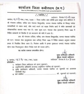 मुख्य कार्यपालन अधिकारी, जिला पंचायत कबीरधाम द्वारा यह आदेश तत्काल प्रभावशील घोषित किया गया है।