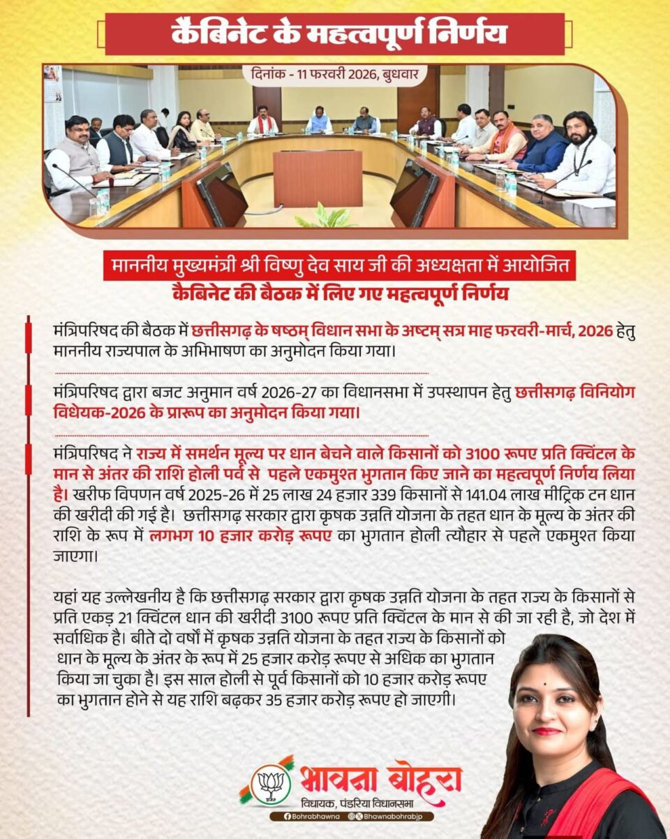 बजट और विधानसभा सत्र: बैठक में फरवरी-मार्च 2026 में होने वाले विधानसभा सत्र के लिए राज्यपाल के अभिभाषण और बजट अनुमान 2026-27 (छत्तीसगढ़ विनियोग विधेयक-2026) के प्रारूप को मंजूरी दे दी गई है।