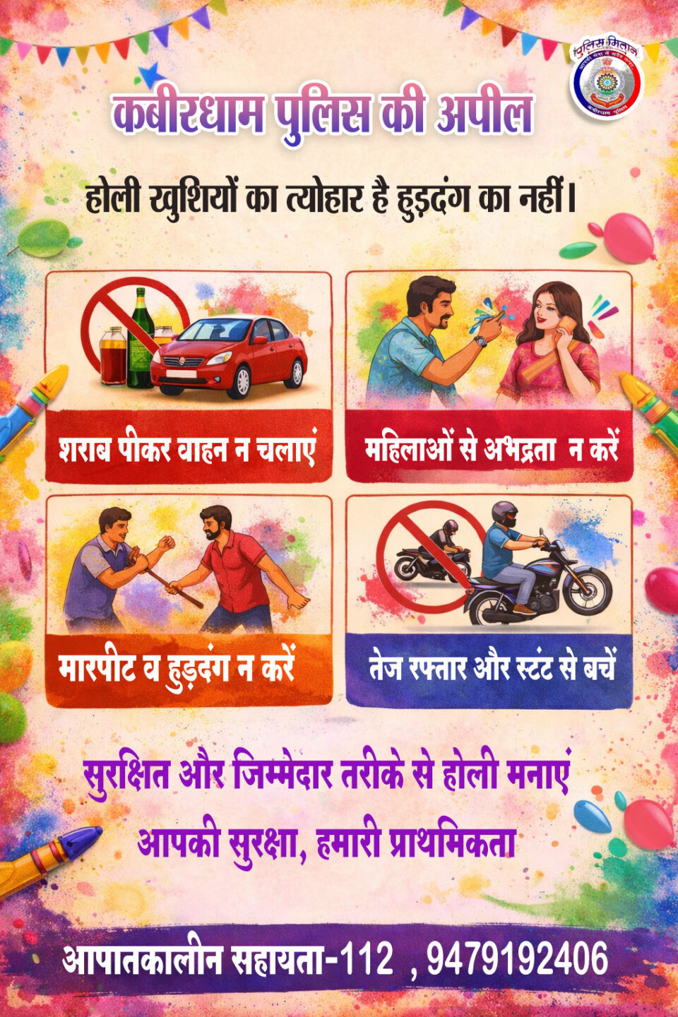 कबीरधाम जिला पुलिस की अपील: होली खुशियों का त्योहार है, हुड़दंग का नहीं