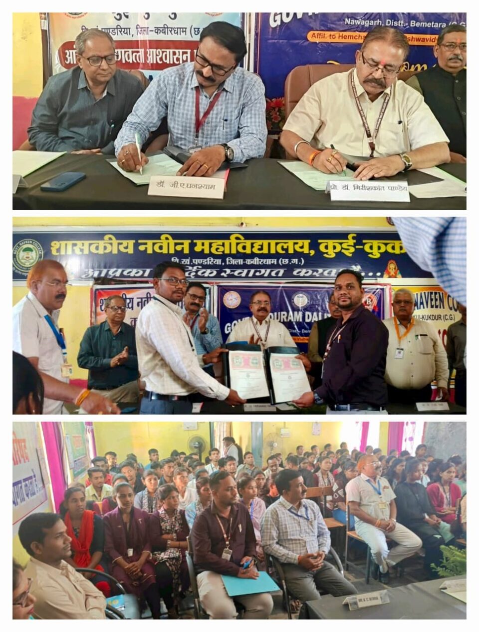 कबीरधाम। शासकीय नवीन महाविद्यालय, कुई-कुकदुर में बुधवार, 25 मार्च 2026 को एक महत्वपूर्ण शैक्षणिक पहल के तहत शासकीय कोदुराम दलित महाविद्यालय, नवागढ़ (जिला बेमेतरा) के साथ समझौता ज्ञापन (MoU) पर हस्ताक्षर किए गए। यह कार्यक्रम महाविद्यालय के प्राचार्य प्रोफेसर (डॉ.) जी. ए. घनश्याम के निर्देशन एवं आंतरिक गुणवत्ता आश्वासन प्रकोष्ठ (IQAC) के तत्वावधान में आयोजित किया गया।